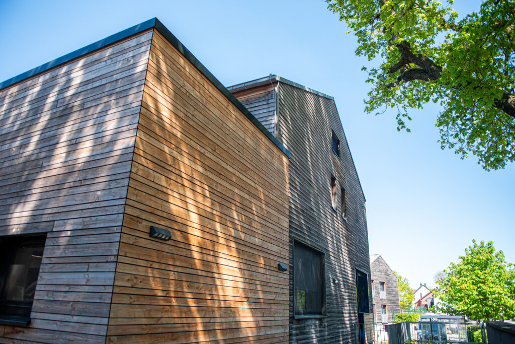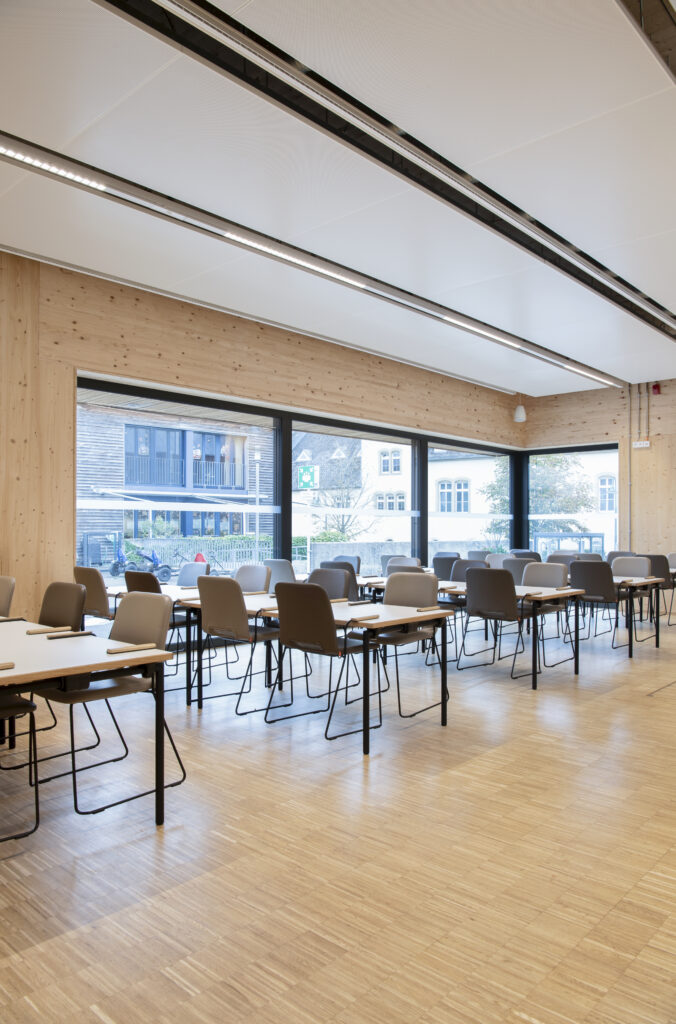 Seuls le sous-sol et le noyau de l’extension de la cafétéria, comprenant l’escalier et l’installation d’ascenseur, sont réalisés en béton armé. Etant donné que l’extension repose sur la structure existante, une construction en bois massif avec des panneaux de contreplaqué croisé a été choisie pour des raisons statiques. La façade de l‘extension crée une image harmonieuse avec l‘existant grâce à son bardage en bois horizontal. Les surfaces en bois apparentes à l’intérieur contribuent également à une atmosphère chaleureuse.