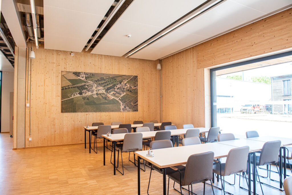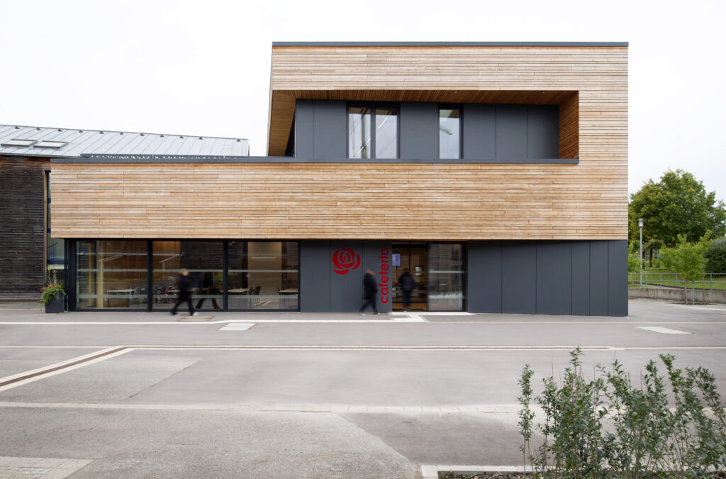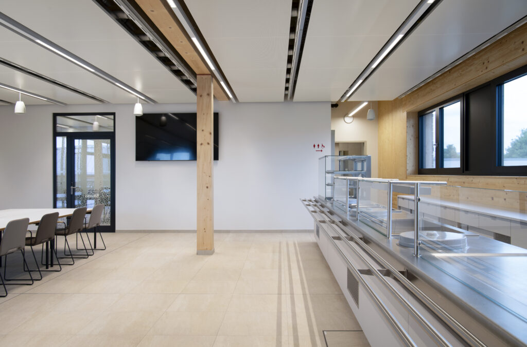 La particularité de cette réalisation réside dans un système constructif bois. Le restaurant et la salle polyvalente du rez-de-chaussée ont été agrandis pour offrir 42 places supplémentaires. L‘ajout de l‘étage crée 48 places complémentaires, ainsi qu‘une salle pour le personnel et une grande terrasse. La cuisine professionnelle a été rénovée et agrandie pour augmenter la capacité de production jusqu’à 400 repas quotidiens.