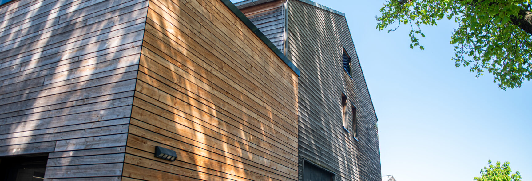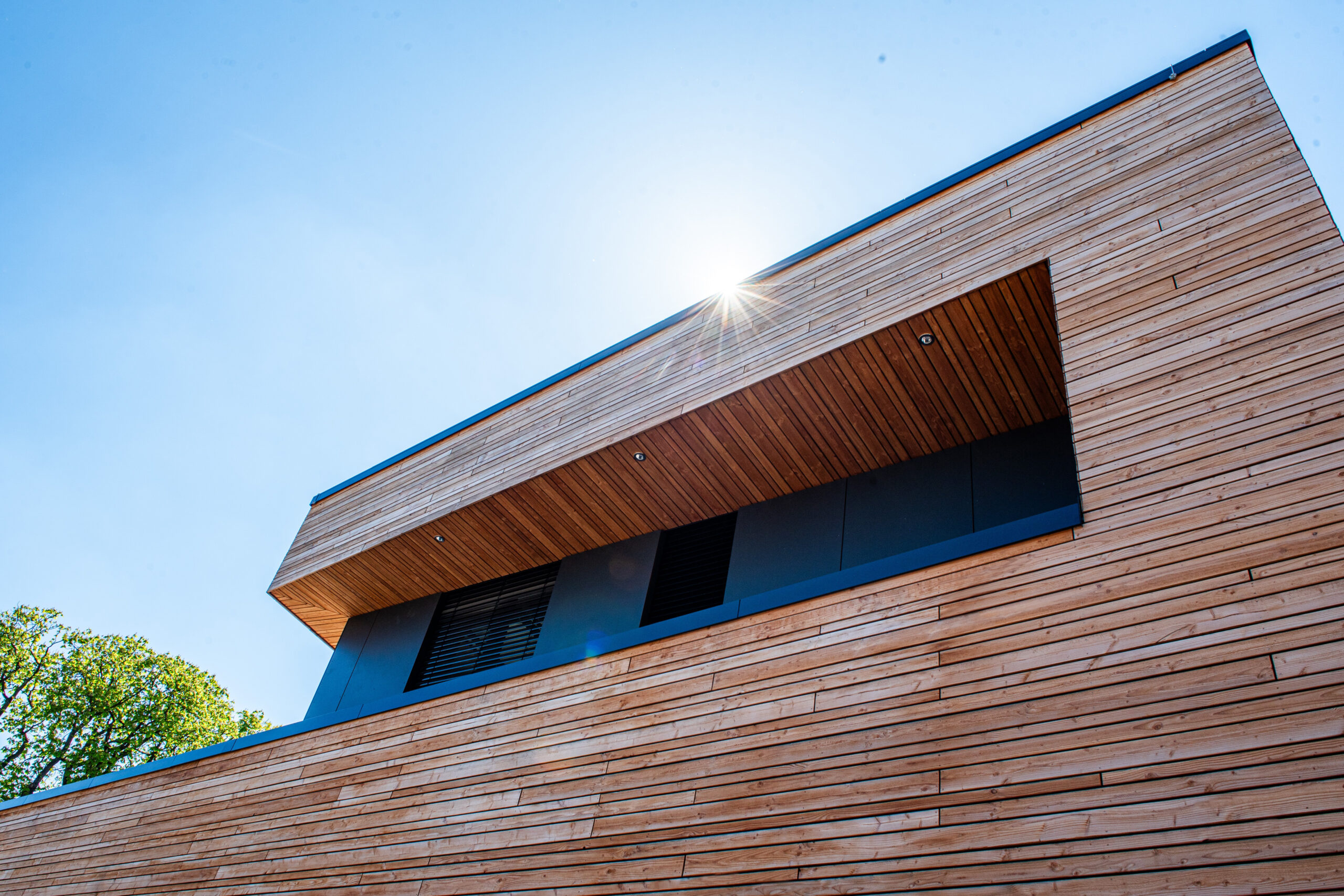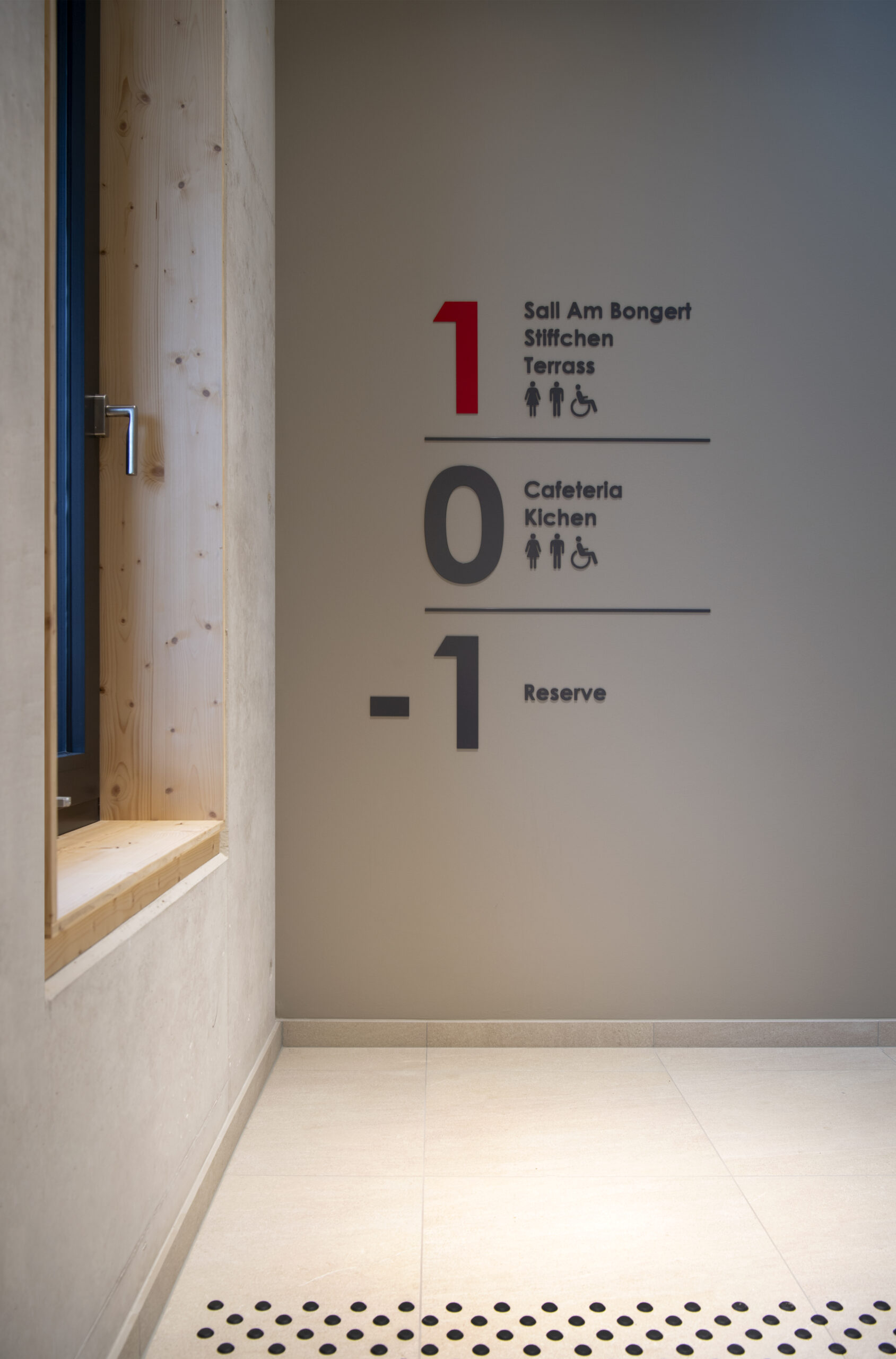 Seuls le sous-sol et le noyau de l’extension de la cafétéria, comprenant l’escalier et l’installation d’ascenseur, sont réalisés en béton armé. Etant donné que l’extension repose sur la structure existante, une construction en bois massif avec des panneaux de contreplaqué croisé a été choisie pour des raisons statiques. La façade de l‘extension crée une image harmonieuse avec l‘existant grâce à son bardage en bois horizontal. Les surfaces en bois apparentes à l’intérieur contribuent également à une atmosphère chaleureuse.