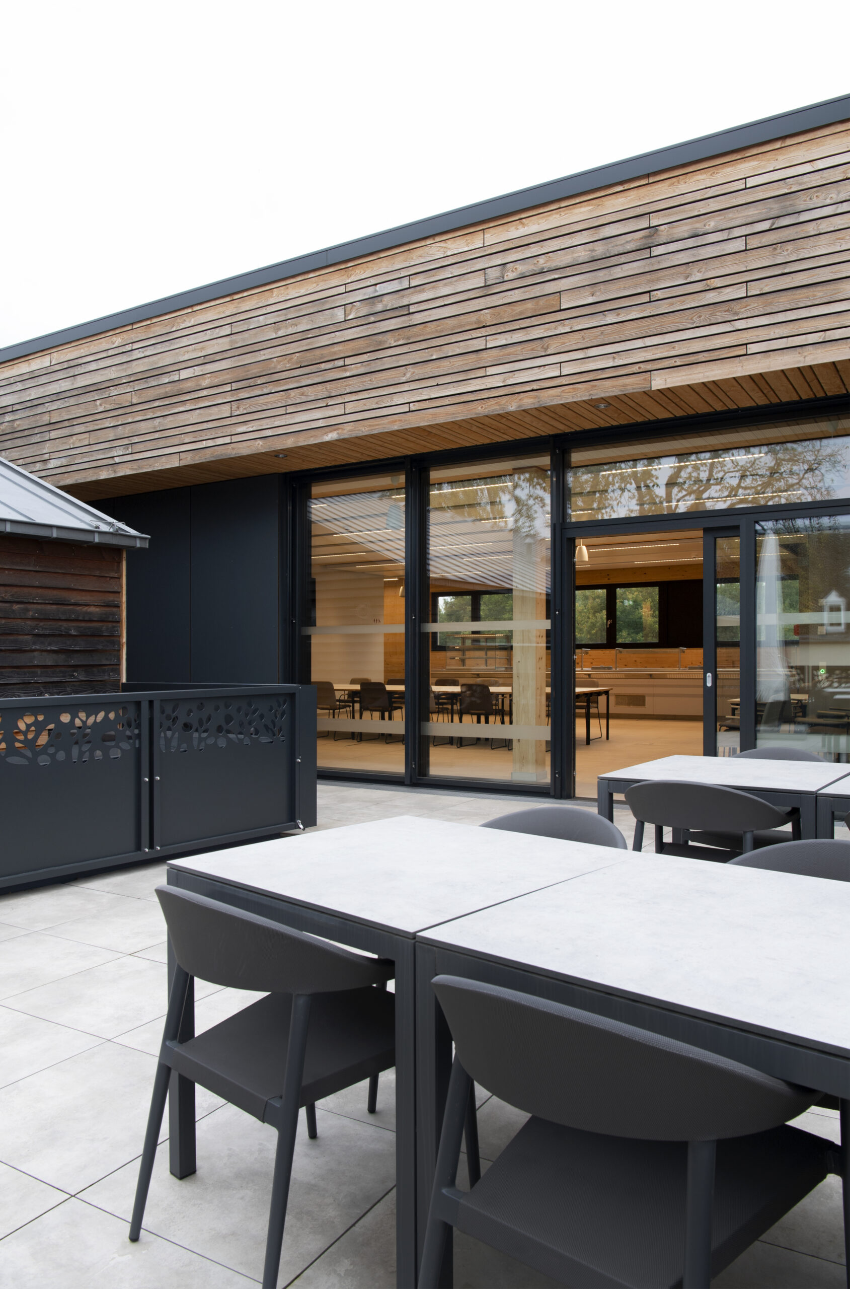 La particularité de cette réalisation réside dans un système constructif bois. Le restaurant et la salle polyvalente du rez-de-chaussée ont été agrandis pour offrir 42 places supplémentaires. L‘ajout de l‘étage crée 48 places complémentaires, ainsi qu‘une salle pour le personnel et une grande terrasse. La cuisine professionnelle a été rénovée et agrandie pour augmenter la capacité de production jusqu’à 400 repas quotidiens.